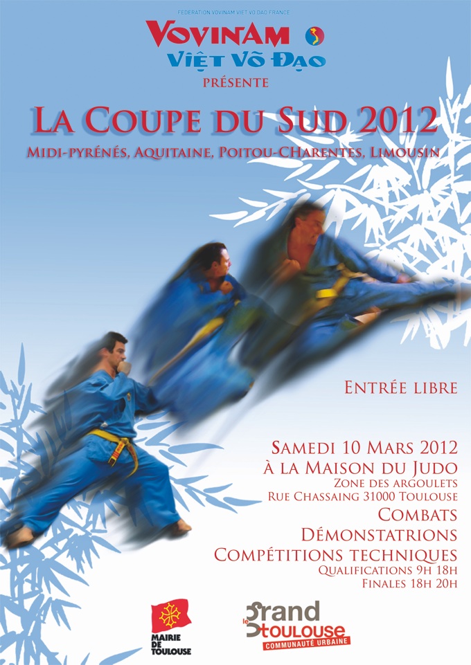 C'est avec un grand plaisir que Le Comité Vovinam Viet Vo Dao Midi-Pyrénées, vous invite à la coupe du Grand Sud le 10 Mars 2012 à la Maison du Judo, zone verte des Argoulets, à Toulouse .